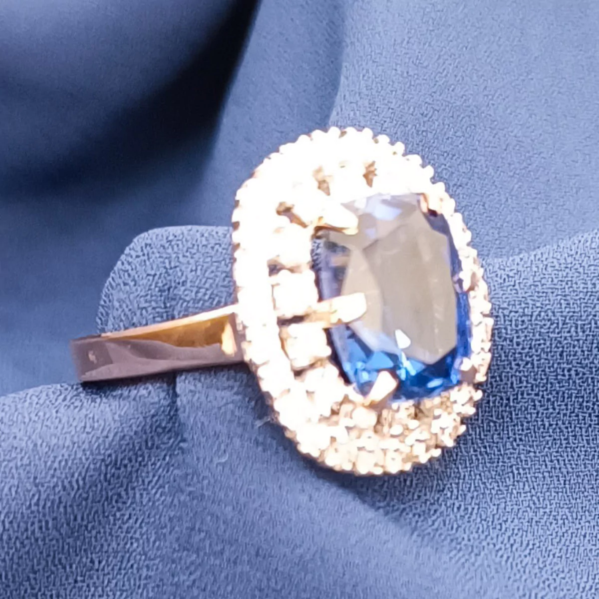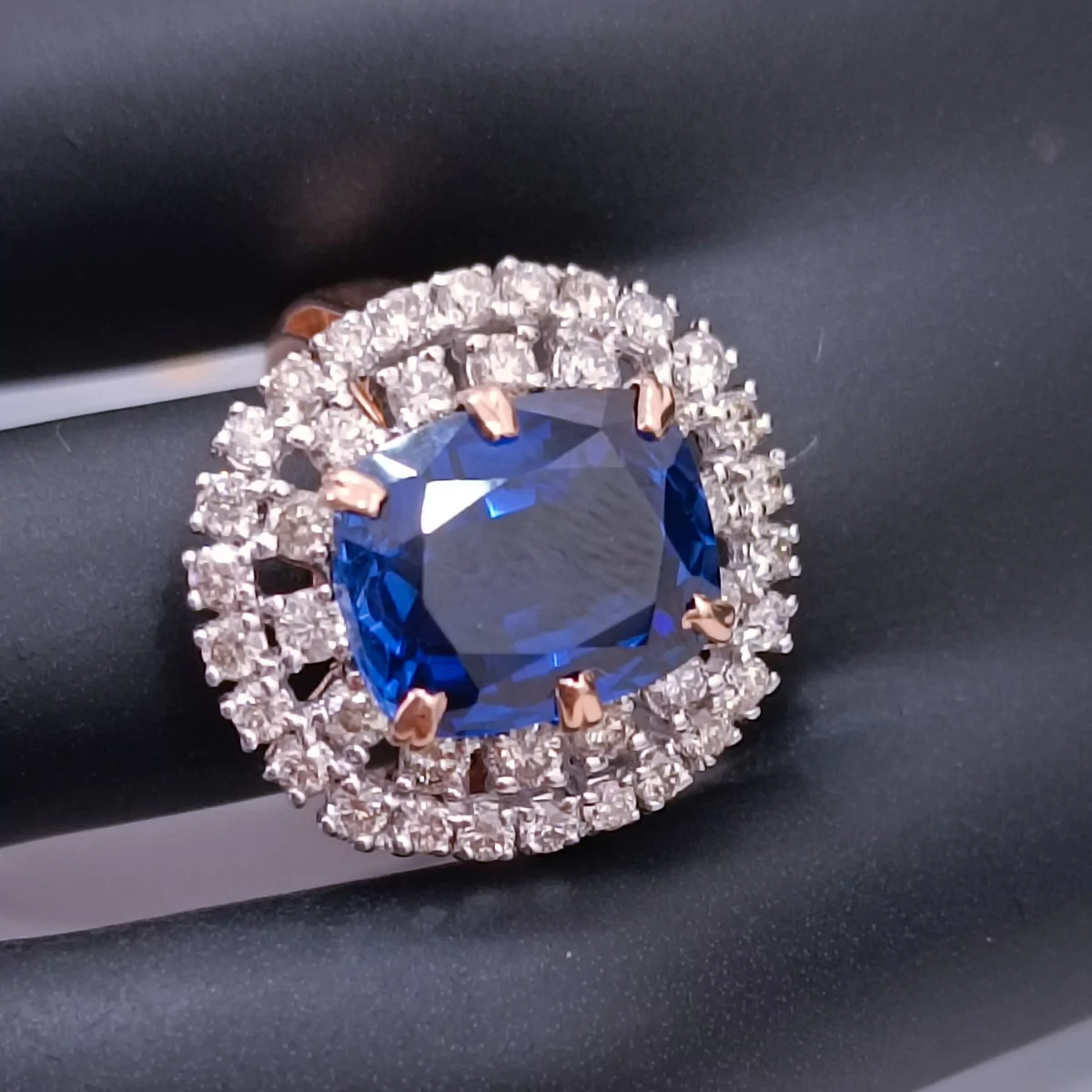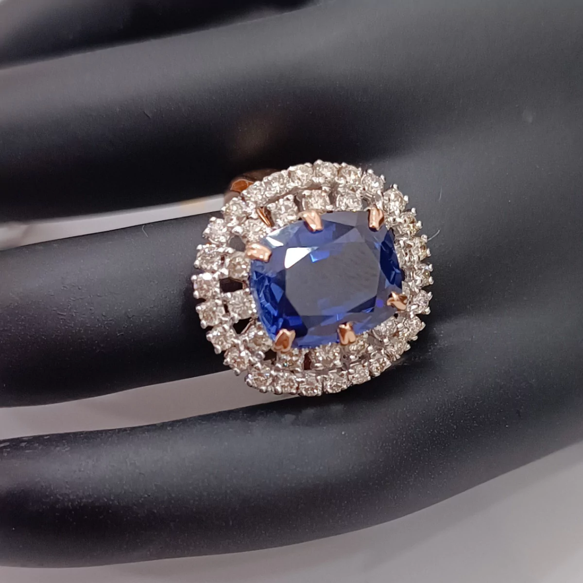 The centerpiece of this remarkable ring is a mesmerizing Kyanite stone, weighing 5.270 grams, which boasts a unique and enchanting blue hue that is both rare and striking. Surrounding the Kyanite stone is a halo of brilliant diamonds, with a total weight of 1.31 carats. These diamonds add a dazzling sparkle that perfectly complements the deep blue of the Kyanite, creating a truly breathtaking effect.