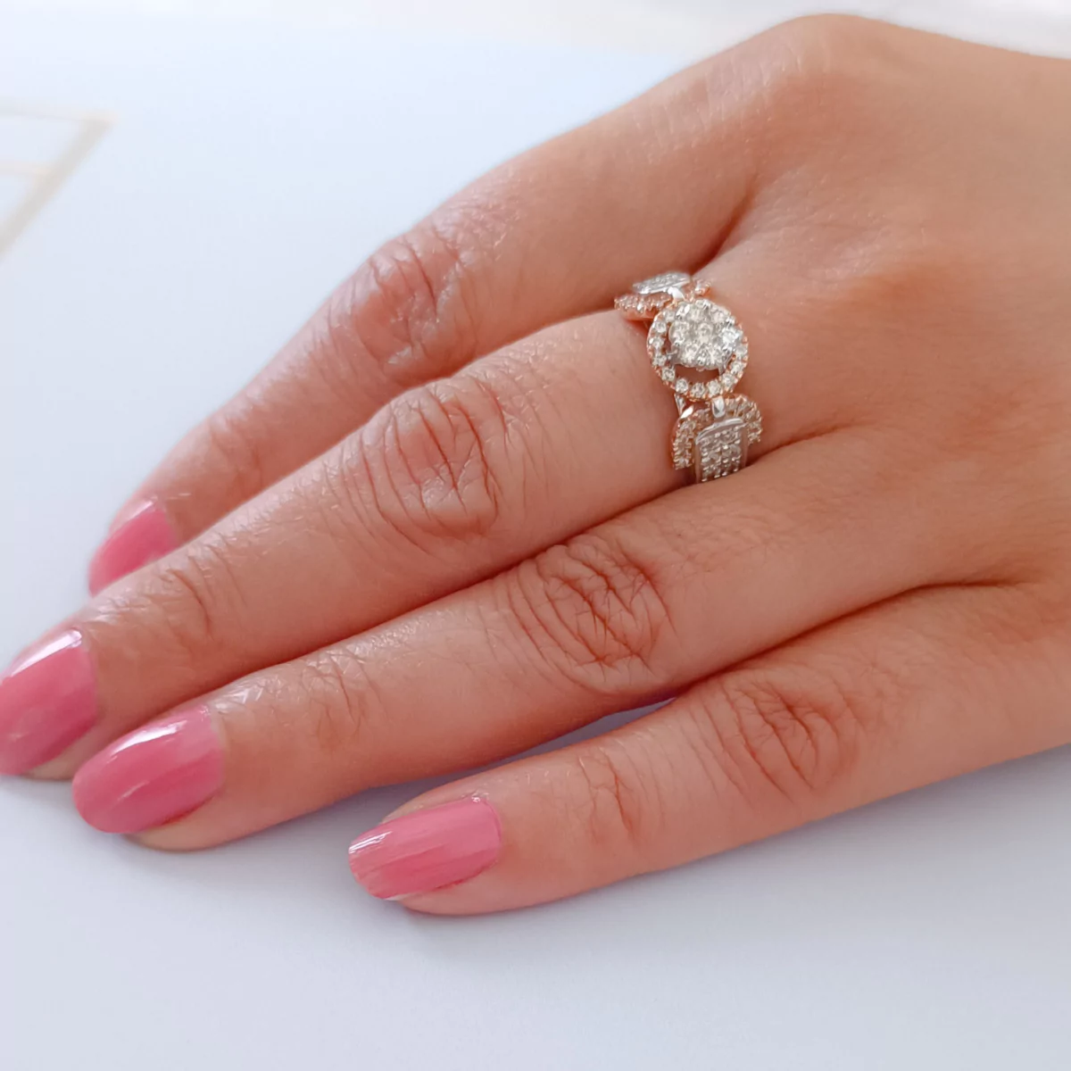 What truly sets this ring apart is the 0.97 carats of brilliant diamonds that grace its design. These diamonds are carefully selected for their exceptional clarity, sparkle, and radiance. The three flower motif, encrusted with these glistening diamonds, adds a touch of nature-inspired charm to your look.